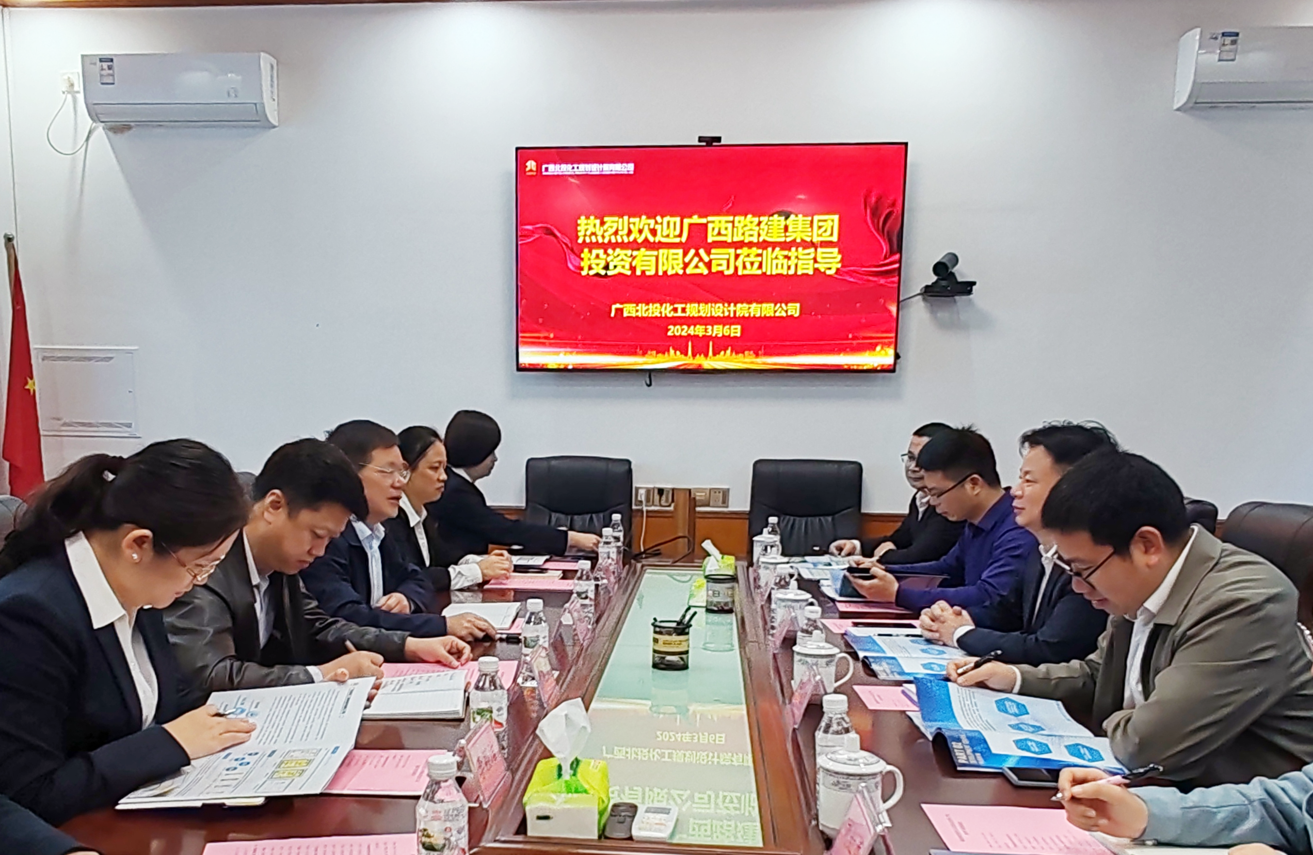 合作共赢促发展,携手共进拓市场。2024年3月6日,广西路建集团投资有限公司党支部书记、董事长李俊平带队到北投化工院进行座谈交流,就行业内部发展情况以及合作切入点开展座谈。北投化工院党委书记、董事长廖永光参加会议。