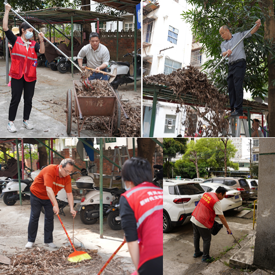 服务志愿者们干劲十足,扛着扫把、耙子清理路面垃圾、堆物,并重点对大院内卫生死角和电车棚顶落叶垃圾进行清理,现场一片热火朝天的景象。